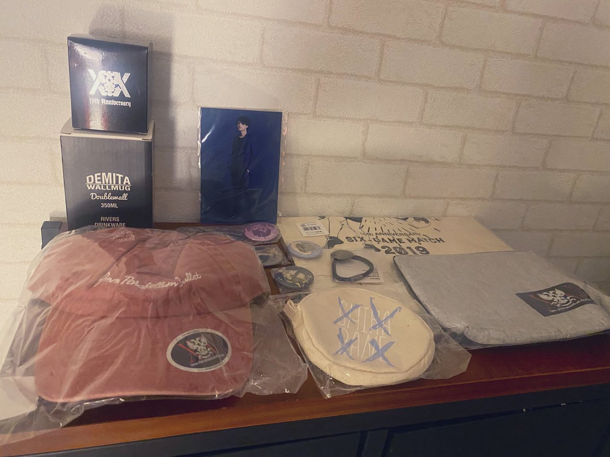 シャツ5枚、キャップ1、アイスウォッチ1、タンブラー1、トート1、ポーチ2、ブロマイ1、缶バッチ6、ヘアゴム1