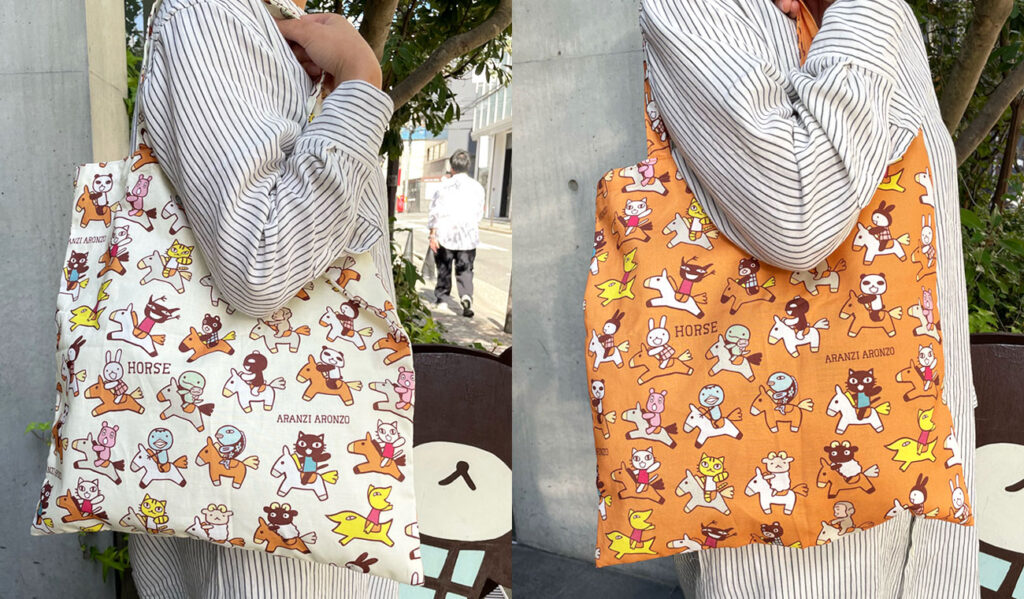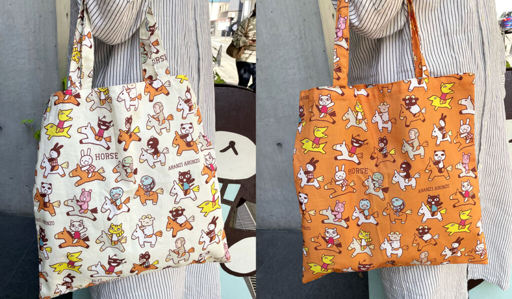 馬に乗って走れ!走れ!のイラストがかわいい、大きなシーチングバッグ入りの特別セットです。オフ白とオレンジの2色展開で、どちらの色が届くかはお楽しみ。中身は福袋用に作られた新商品ばかりです!