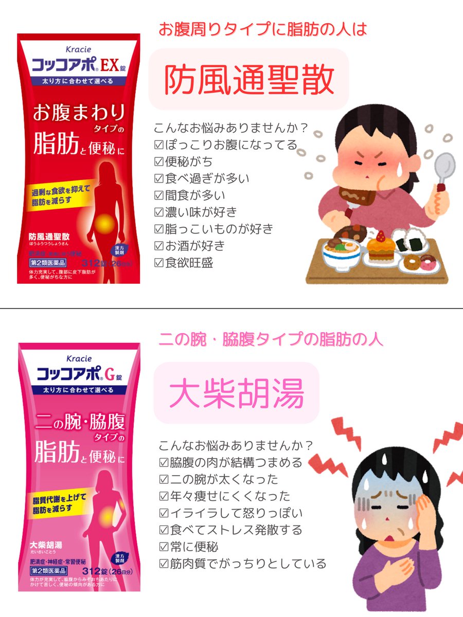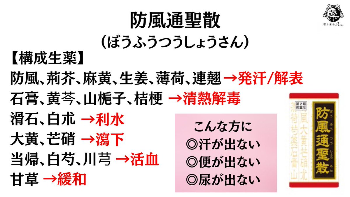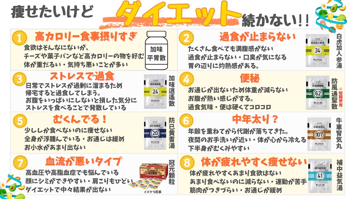 ダイエット目的で防已黄耆湯が使われがちだけど、きちんと肥満のタイプを見極めて選択できてる?防風通聖散もそうだけど間違った使い方をするとかえって体調が悪化することがあるよ。防已黄耆湯は脾肺気虚の水太りタイプに、防風通聖散は大食肥満の便秘タイプに使用するよ。特に防風通聖散に関しては基本的には短期間の服用にとどめた方が良いことも覚えておこう🤴✨