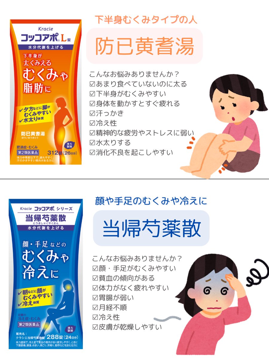 浮腫で悩んでる友達が防風通聖散飲み続けてるけどイマイチ効果分からないって悩んでたから、浮腫に効く「防已黄耆湯」勧めたら浮腫も取れてあっという間に痩せてた。お肉の着く位置、脂肪か浮腫か見極めること、自分に合った漢方飲むだけで私は-15kg痩せた..