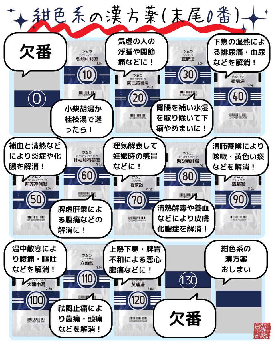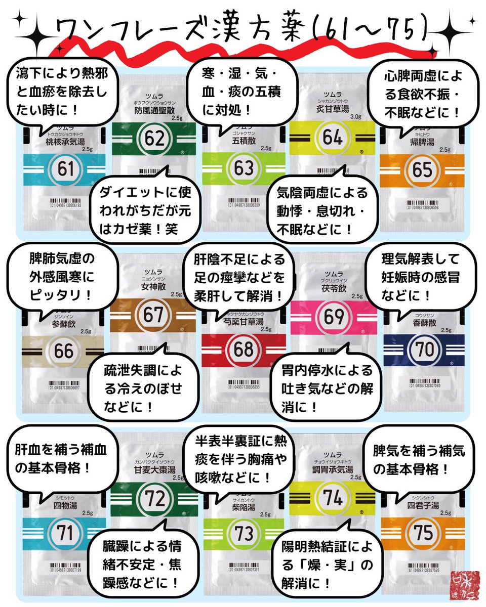 ツムラの漢方薬を“ワンフレーズ”でまとめてるよ。今回は61番〜75番。ダイエットに効果的と謳われがちな防風通聖散が「実は、もともとはカゼ薬なんだよ」と教えてあげると大抵の人はおったまげる。ドヤ顔で語れる知識なので知り合いに教えてあげよう🤴✨👇