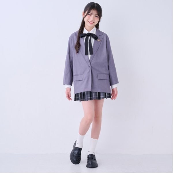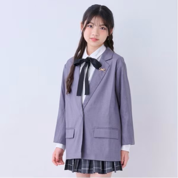 衿元にはパールのついたリボンのピンバッジを飾り、上品なアクセントをプラス。