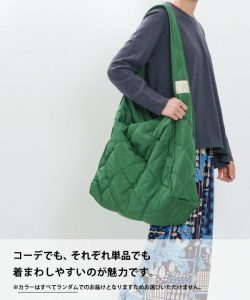 縦ラインですっきり見える柄ワイドパンツ、ヒップまわりをカバーするフレアカットソーで即コーデ完成。オリジナルキルティングバッグは大容量で実用性抜群!