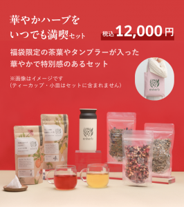 「笑顔ひろがるハーバルライフセット」(税込12,000円)は、福袋限定を含む4種のハーブティーをはじめ、ハーブコスメにハーブティーキャニスター、オリジナルトートバッグの全8点をセット。