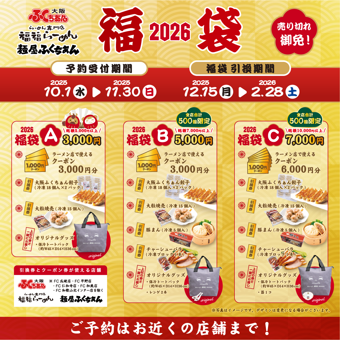 今年も「大阪ふくちぁんラーメン」「福福らーめん」「麺屋ふくちぁん」「大阪ふくちぁん餃子」福袋が安く買える季節がやってきましたよ📅٩(ˊᗜˋ*)و
