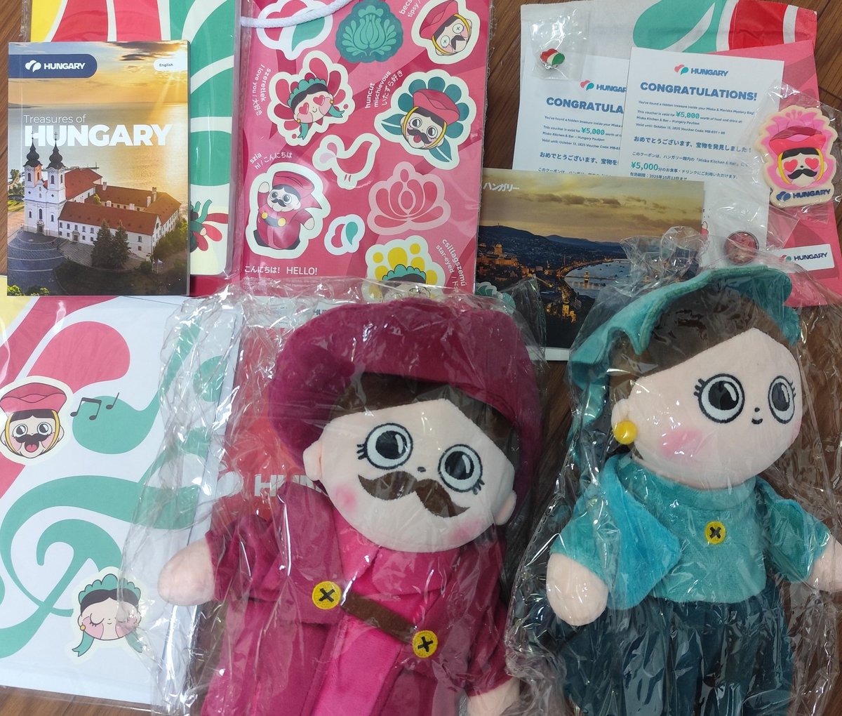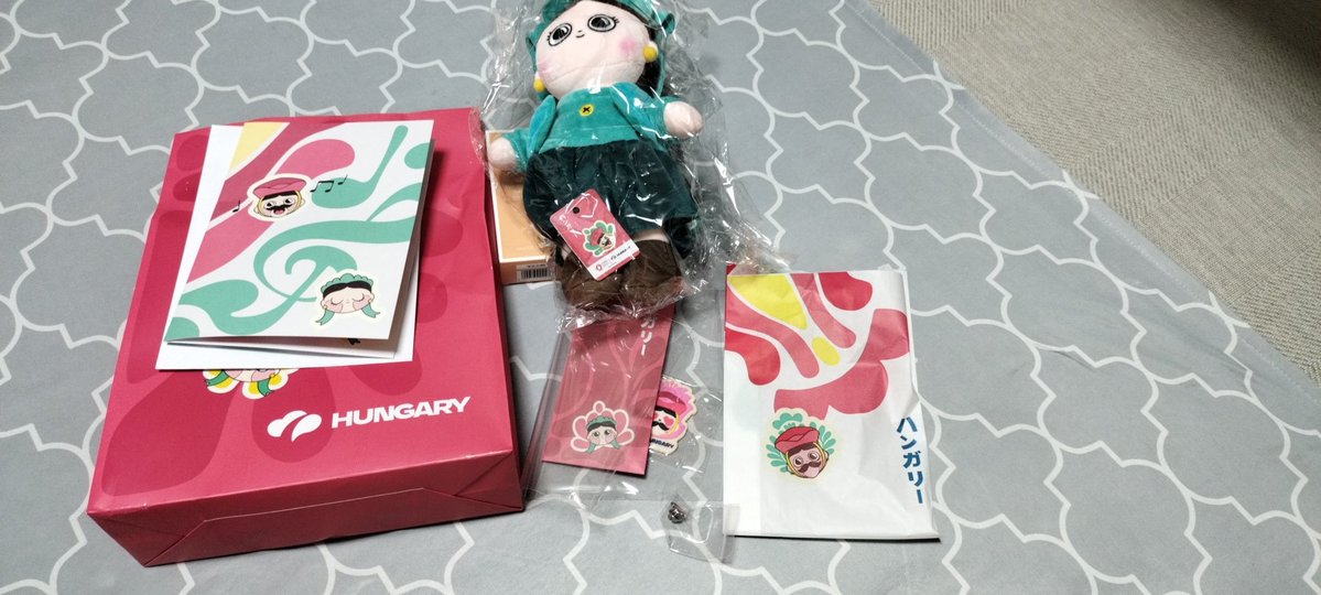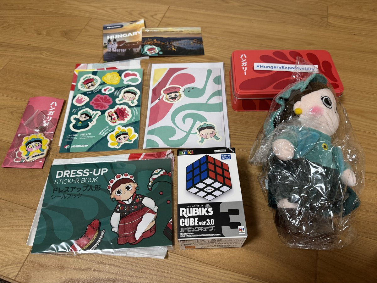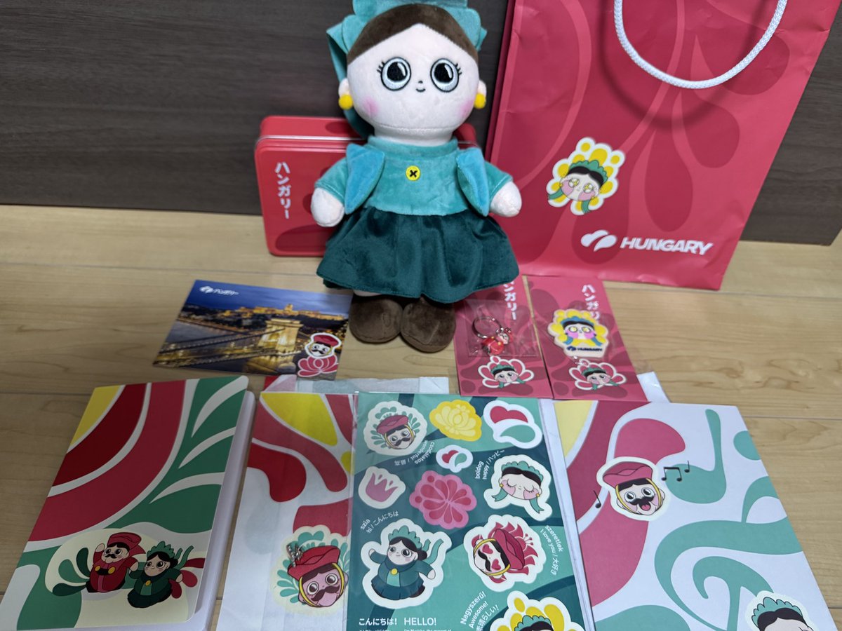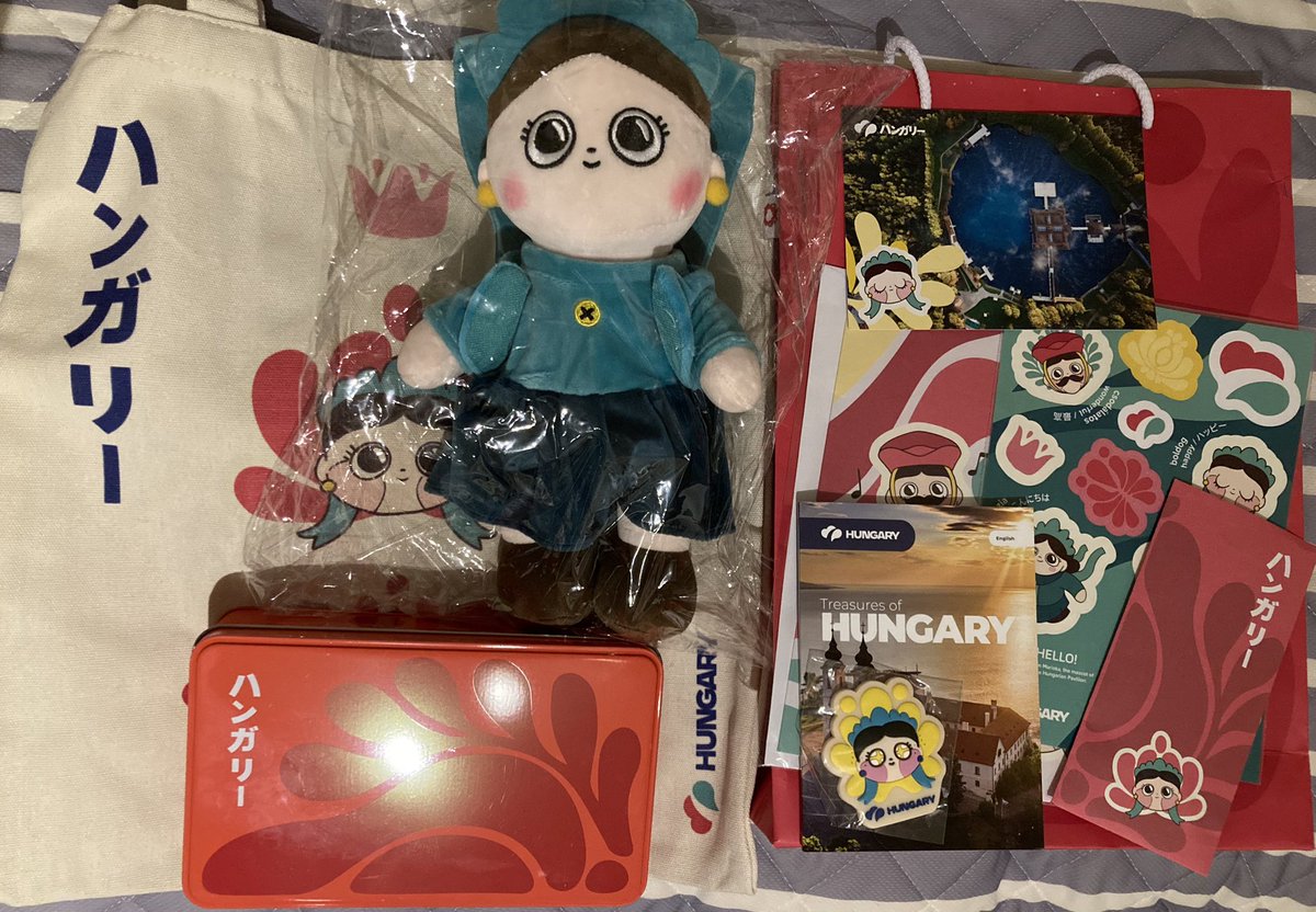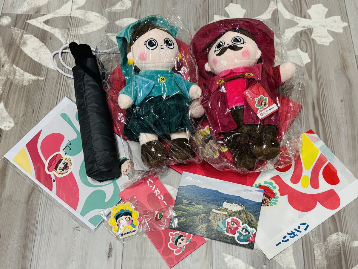 ミシュカのぬいぐるみ、スタッフ用ピンバッジ2個(非売品)、ボタンひとつで開閉する折りたたみ傘、マグネット、シール、ポストカード、メガネ拭き、小物入れ缶、ハンガリーのミニガイドブック(英語)、開くと音楽の流れるカードの合計12点🎁お食事券は入ってなかったけど(残念!)、帰って開けるまでのワクワク感や、非売品まで入ってて、買って良かったー😊 税込8228円でした。