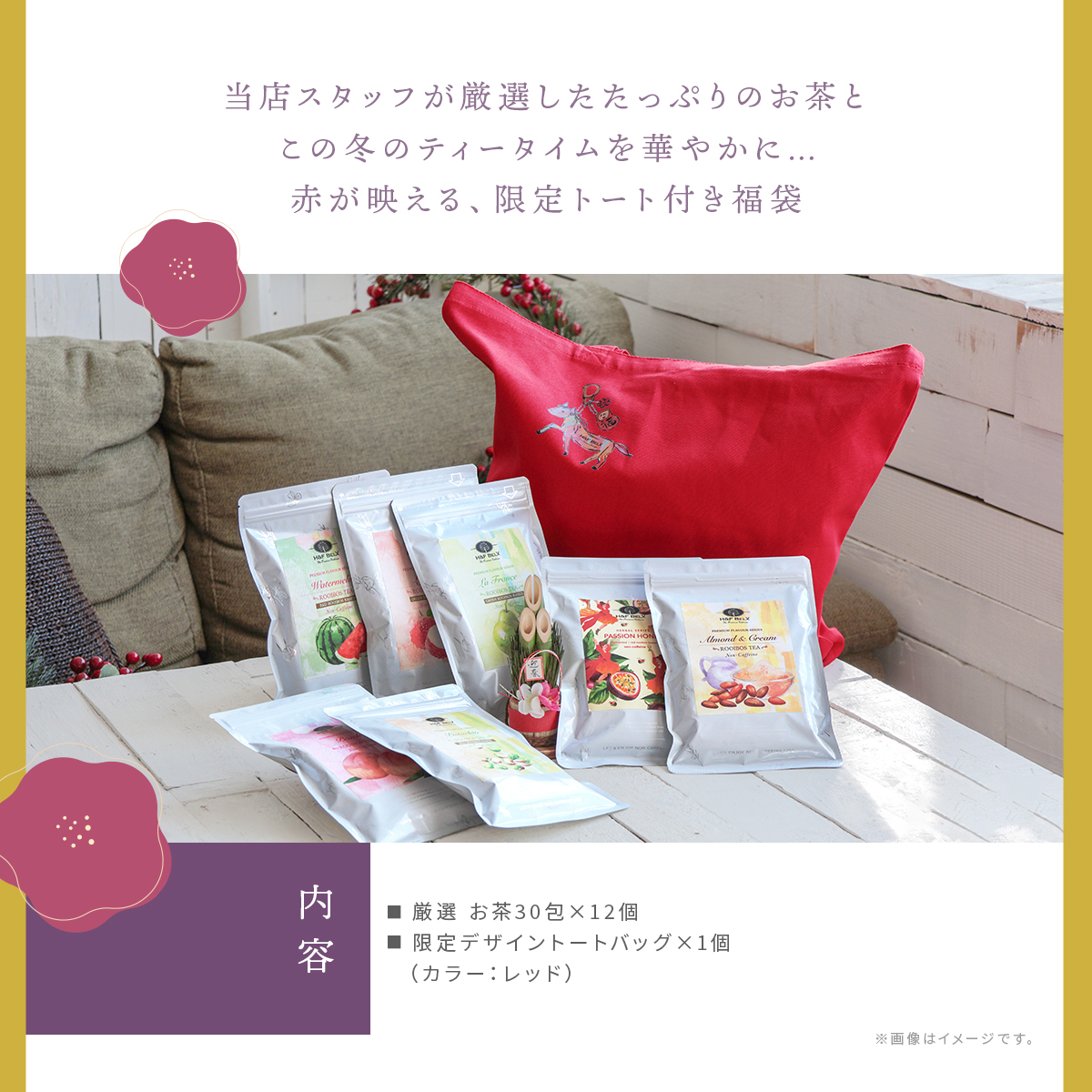 大きなレッドのトートバッグ付きで、福袋ひとつで一年中ルイボスティーを楽しめる贅沢セットです。(送料無料)