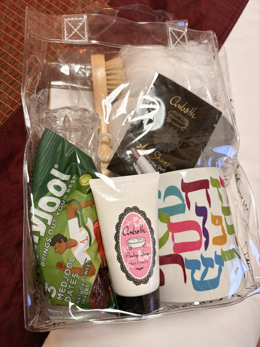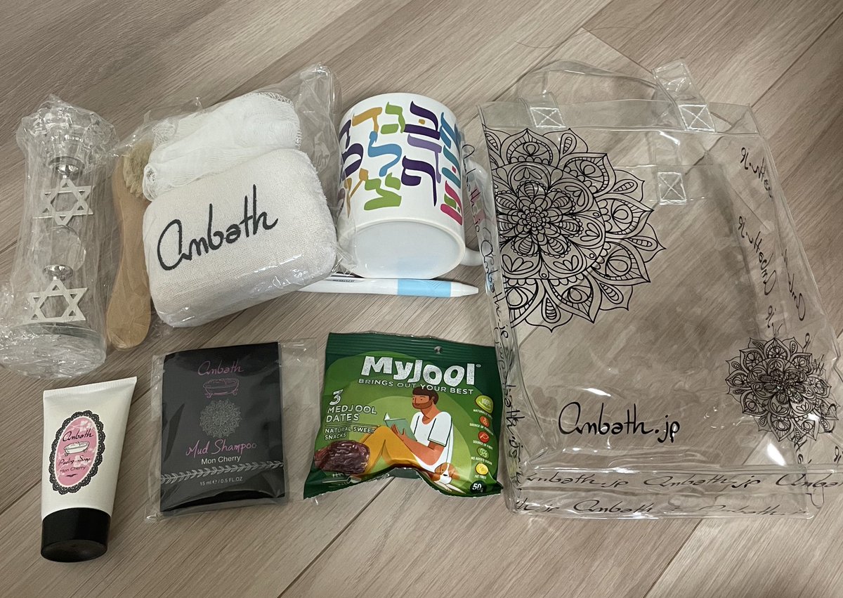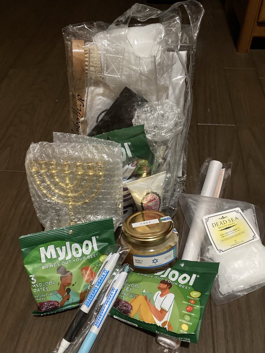 中身はシャンプーとリンスの小袋、ピーリングソープのチューブ、🛁用品(ミニブラシ、泡立てネット、ボディ🧽)。マグカップ、ボールペン、ダビデの星をあしらったミニキャンドル台、ナツメヤシの実でした。