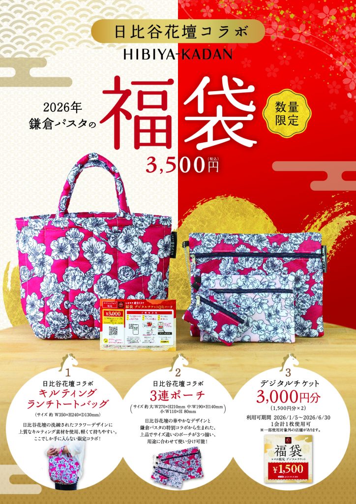 毎年恒例の鎌倉パスタの福袋2026が登場!日比谷花壇とコラボしたトート&ポーチと、食事に使えるデジタルチケットがセットになった新春限定福袋です。