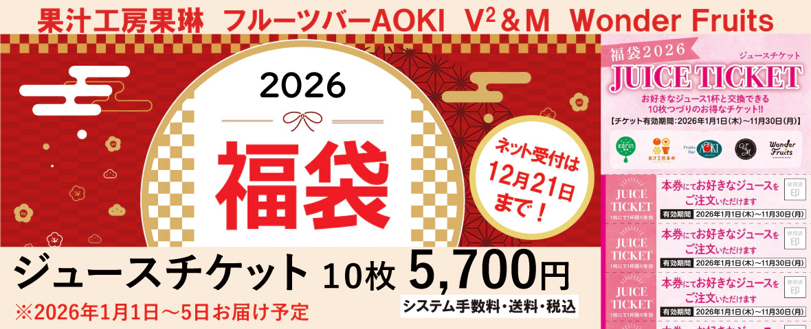 全国のフルーツジュースバー(果汁工房果琳/Wonder Fruits/フルーツバーAOKI/V²&M)で使えるお得なジュースチケット福袋です。