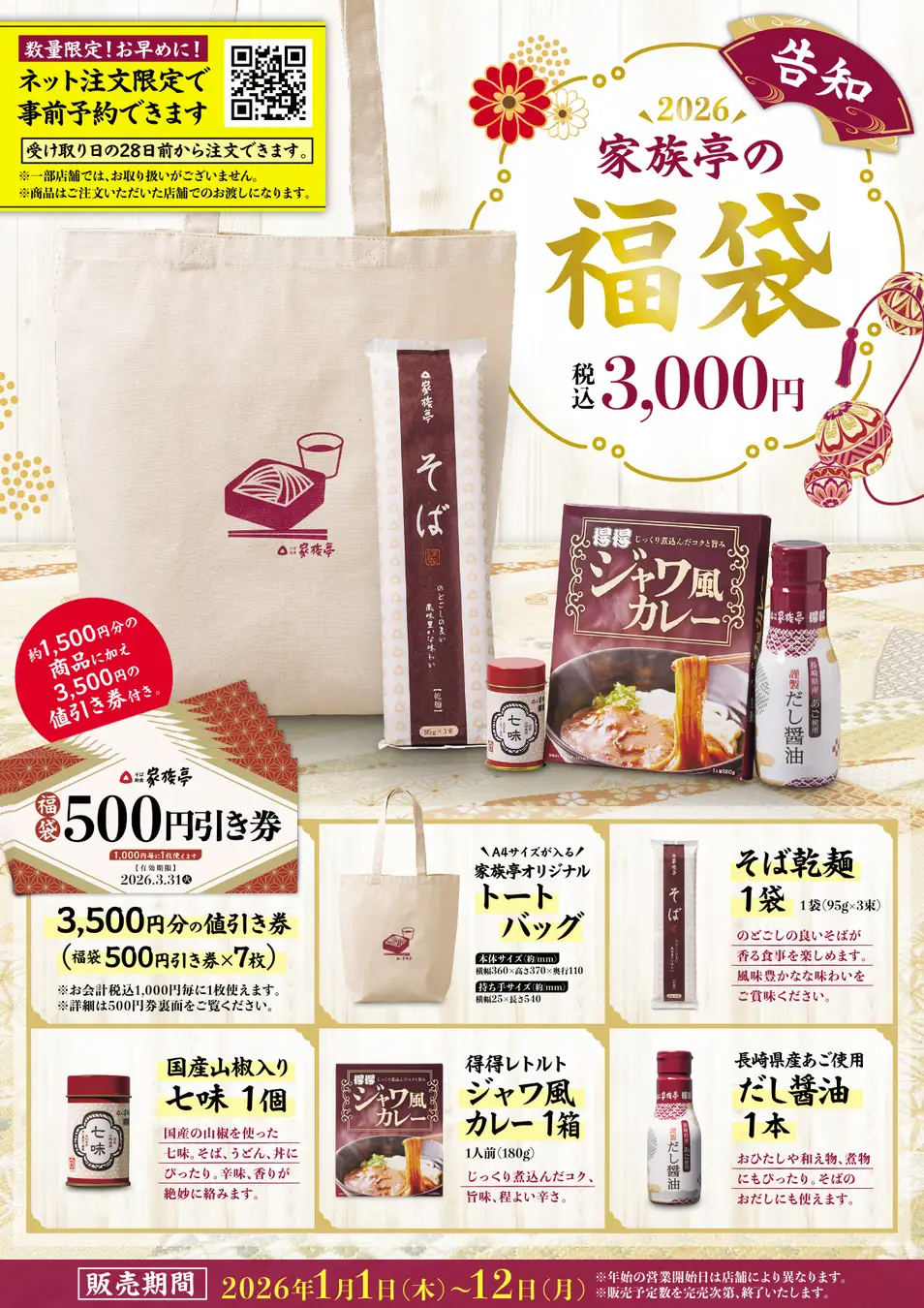 そば和食チェーン「家族亭」から、値引き券とオリジナルグッズが詰まったお得な福袋が登場!