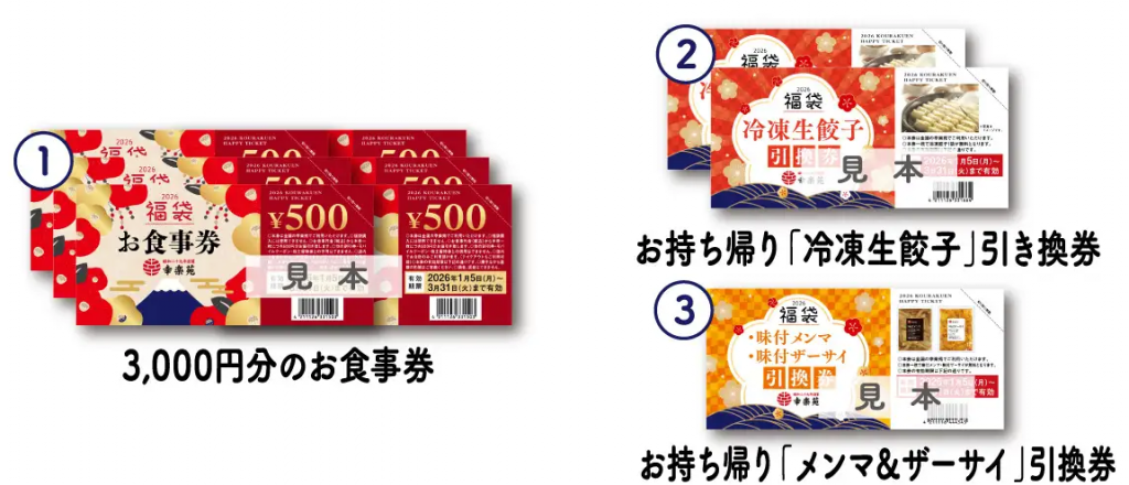 3,000円 福袋:3,000円分お食事券+餃子&メンマ引換券入り!総額4,990円相当の超お得セット🎉
