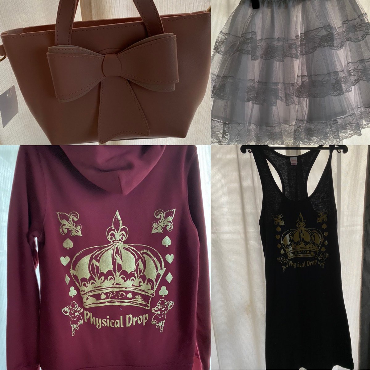 Physical Drop様の(@PhysicalDrop )福袋届きました ✨ スタンドカラーチュニック(黒) レースカラーロングドレス(紺?黒?) まさかのパニエ パーカー(バーガンディ) ロングタンクトップ 2wayリボンバック(ピンク) これで大当たりじゃないってどういうことなんやろ…加藤さん太っ腹過ぎ