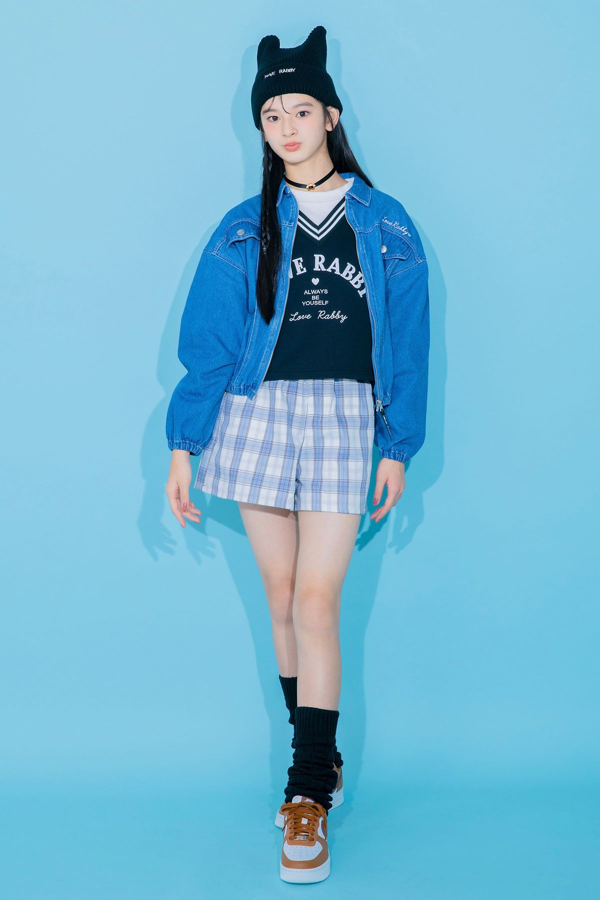 Vネックニット×デニムジャケットのスポプレスタイルに、チェック柄ショーパン&ネコ耳ニット帽などトレンドもバッチリ!