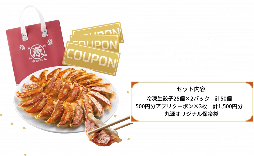 1,500円(税込)福袋:冷凍生餃子50個に、保冷袋&アプリクーポン1,500円分(500円×3枚)付き。