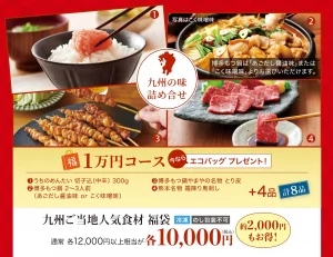10,000円 福袋:九州の味を詰め合わせ。もつ鍋・明太・馬刺しなど全8品