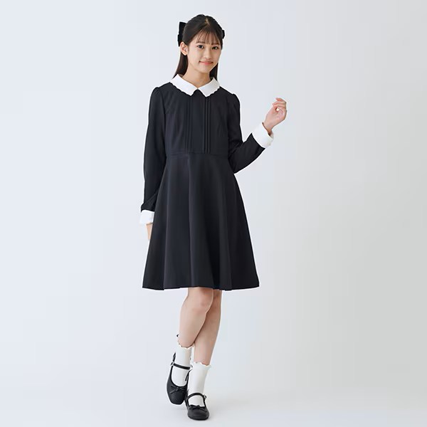 繊細なレースにラインストーンをほどこした白衿がきちんと感と上品な印象を与える、フレアシルエットのワンピースです。