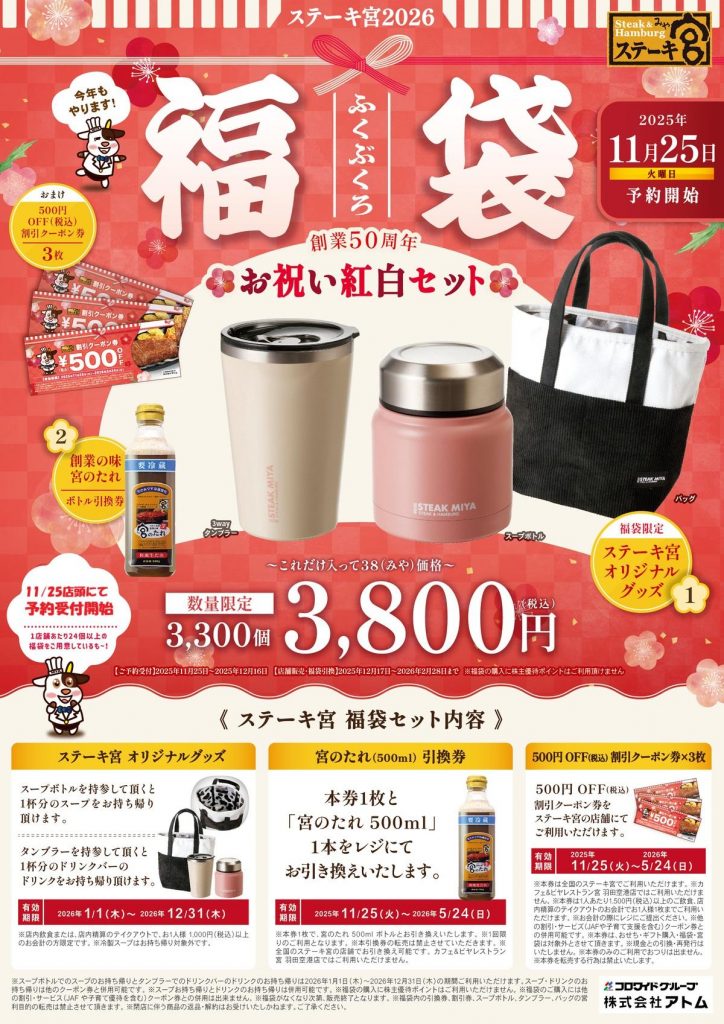 毎年恒例のステーキ宮の福袋2026が登場!オリジナルグッズやクーポン券が入った特別セットで、スープ&ドリンクのテイクアウト特典も!