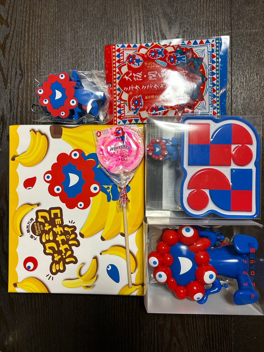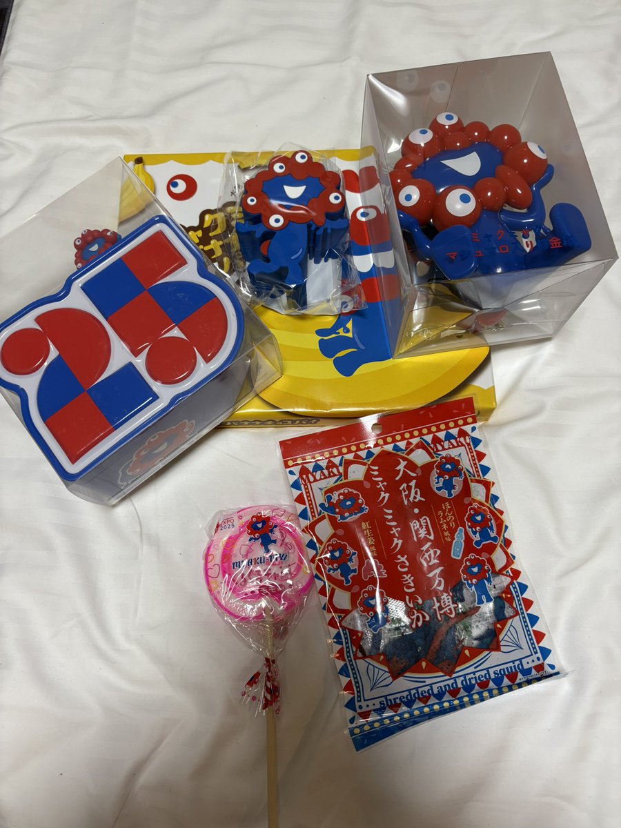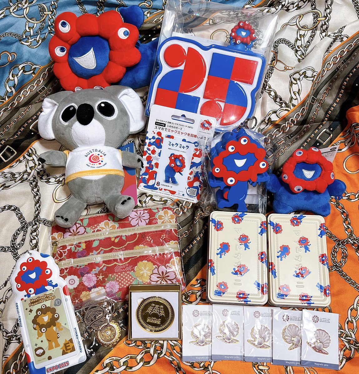 こちら開幕直行で手に入れたミャクミャクお楽しみ袋。かわいい物が沢山入ってました🔴🔵