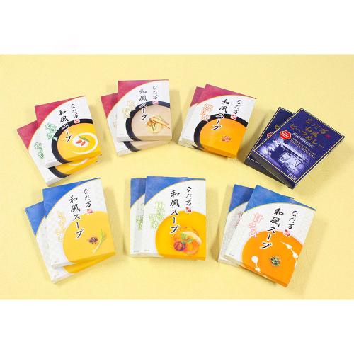 和風スープ(渡り蟹、かぼちゃ、繊維野菜、甘えび、10種の野菜、とうもろこし)6種が1食ずつと、和風ビーフカレーが2食入ったセットです。