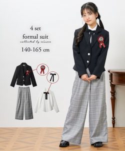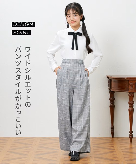 グレンチェックのワイドロングパンツがポイントのフォーマルスーツ5点セットです。
