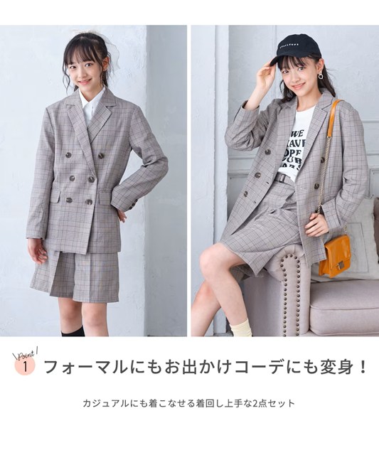 ダブルボタンのジャケットとキュロットのセットアップです。