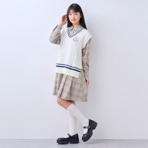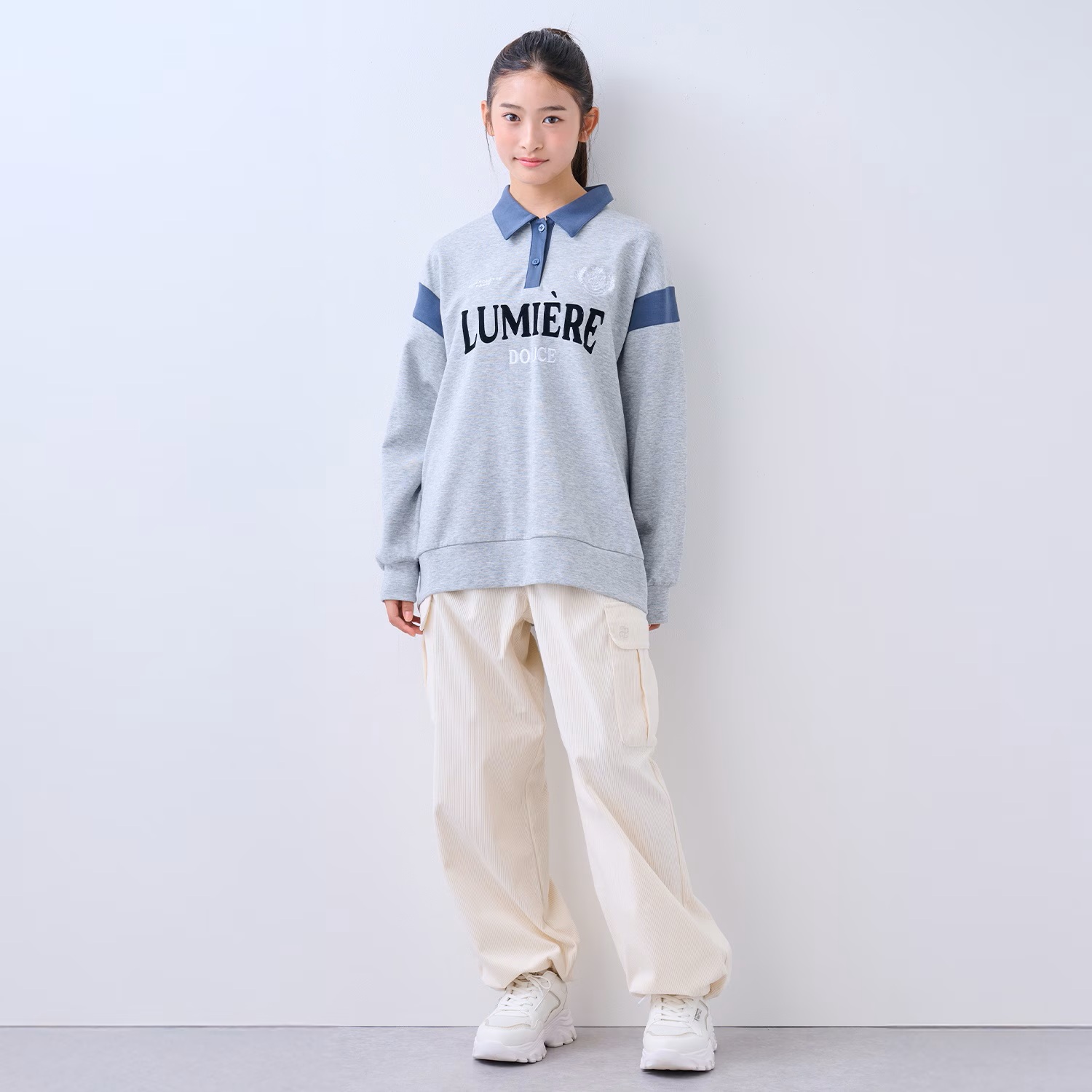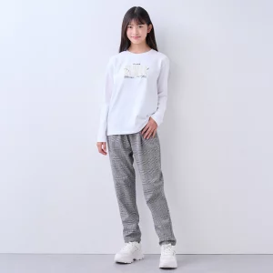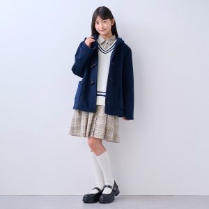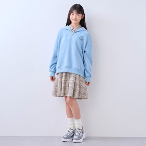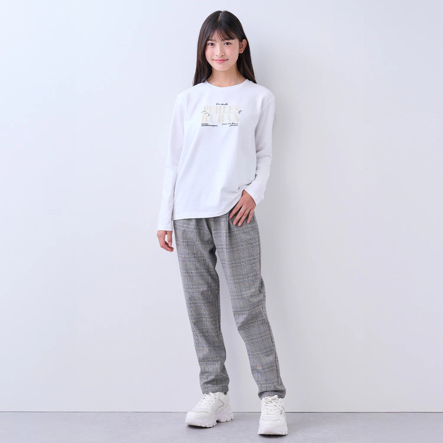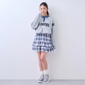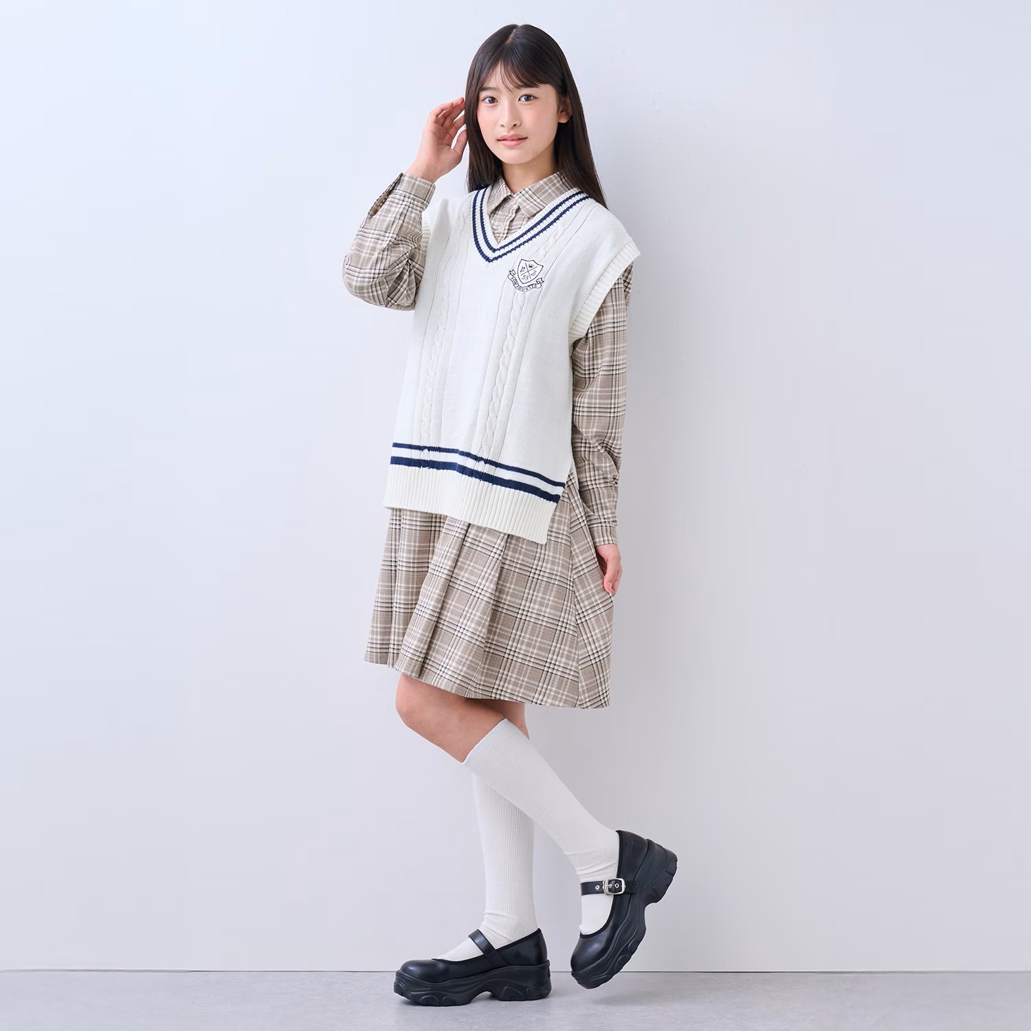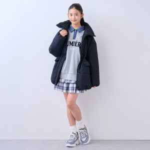 様々な着こなしとマッチするシンプルなコートは、ポケット口にロゴ刺しゅうを添えてアクセントに。コーデの主役となるチェック柄スカパンはウエストのボタン飾りが目を引きます。