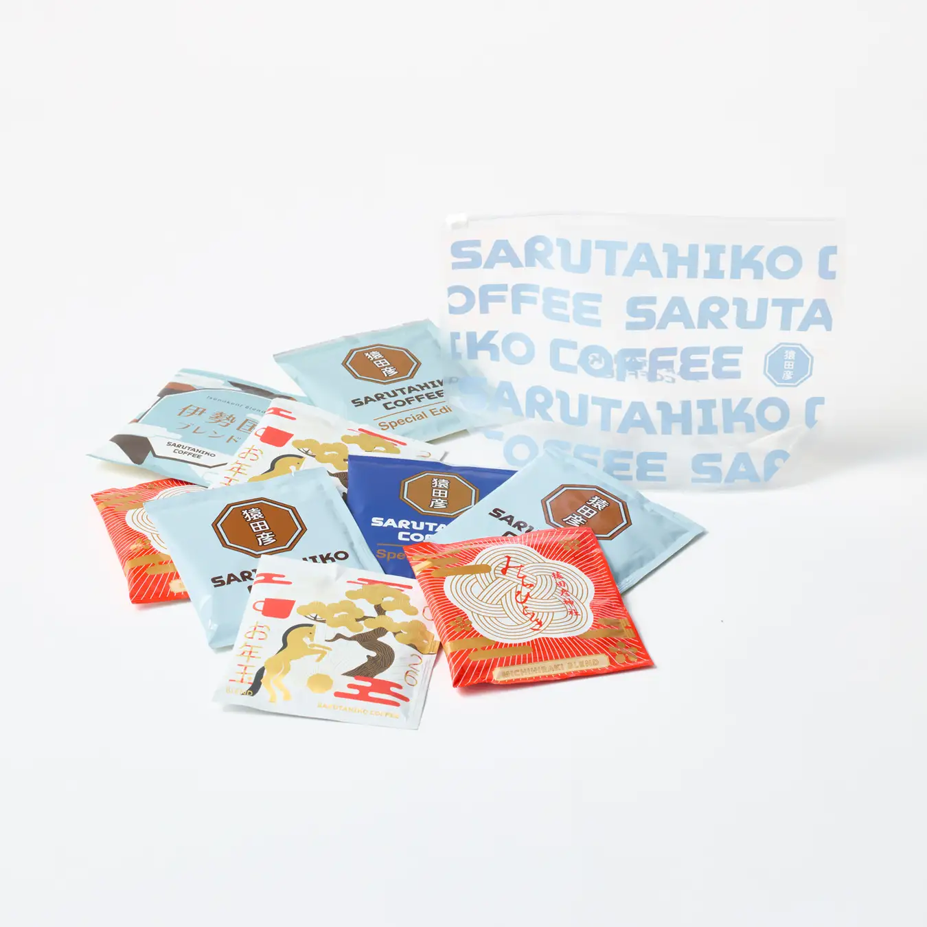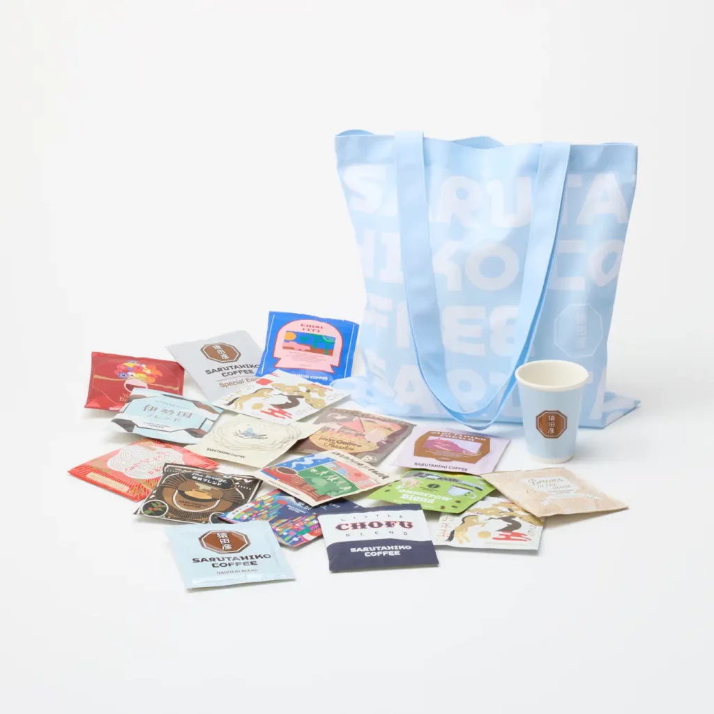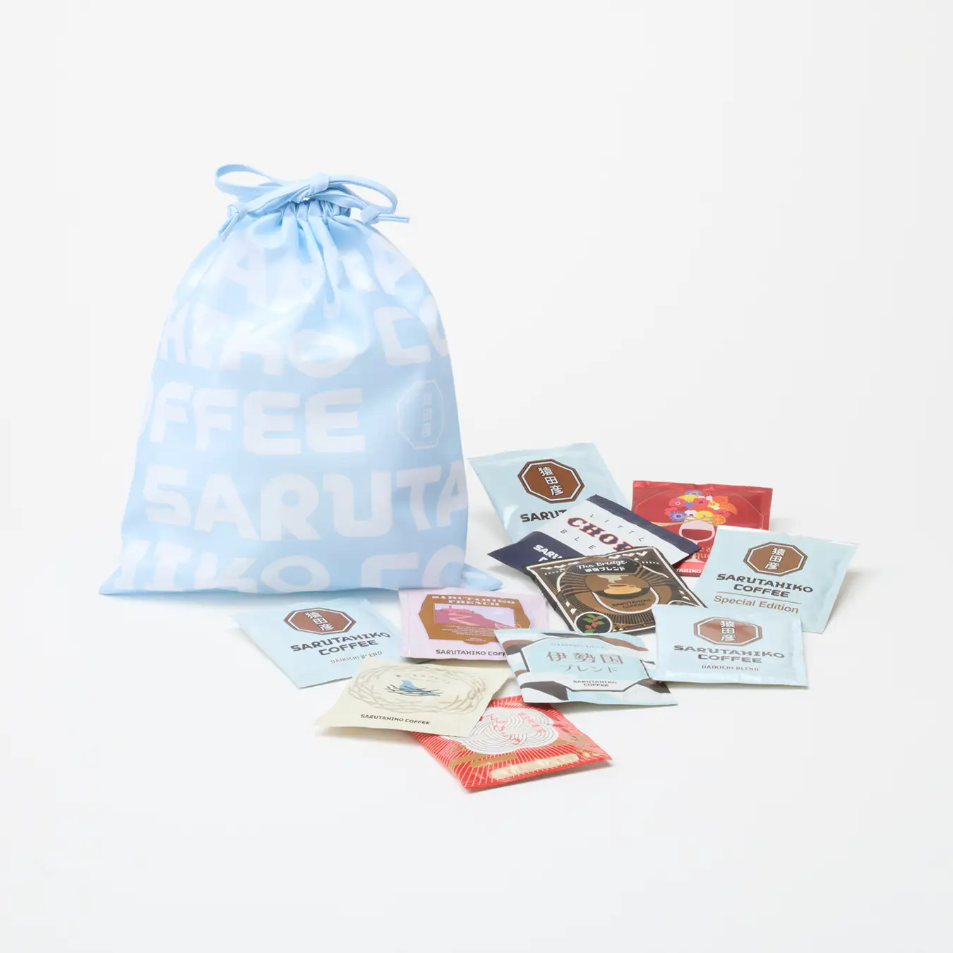 普段から猿田彦珈琲のドリップバッグをご利用の方や、地方店舗限定のドリップバッグを手に取りやすい価格で楽しみたい方におすすめのセット。福袋限定巾着付きです。
