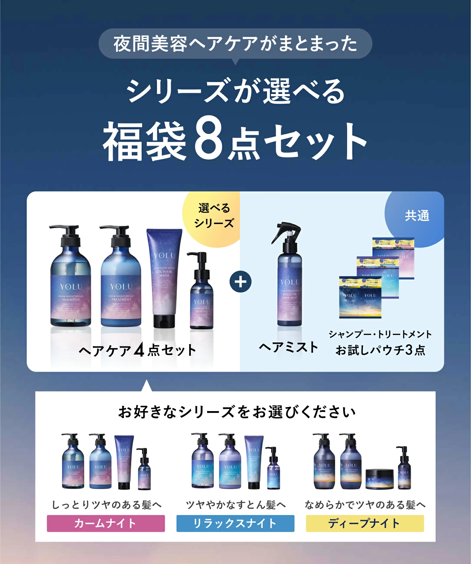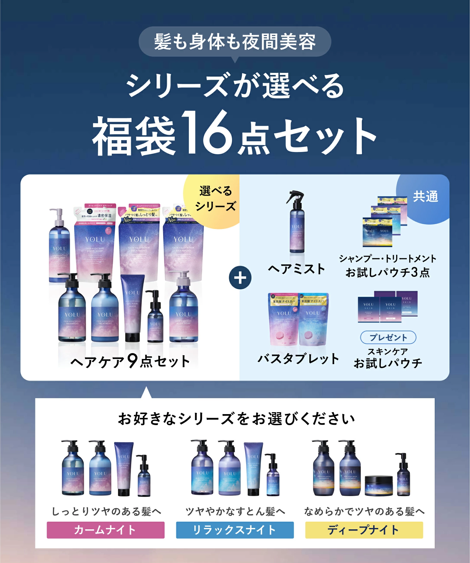 人気の「カームナイト」「リラックスナイト」「ディープナイト」シリーズをライン使いできる内容です。